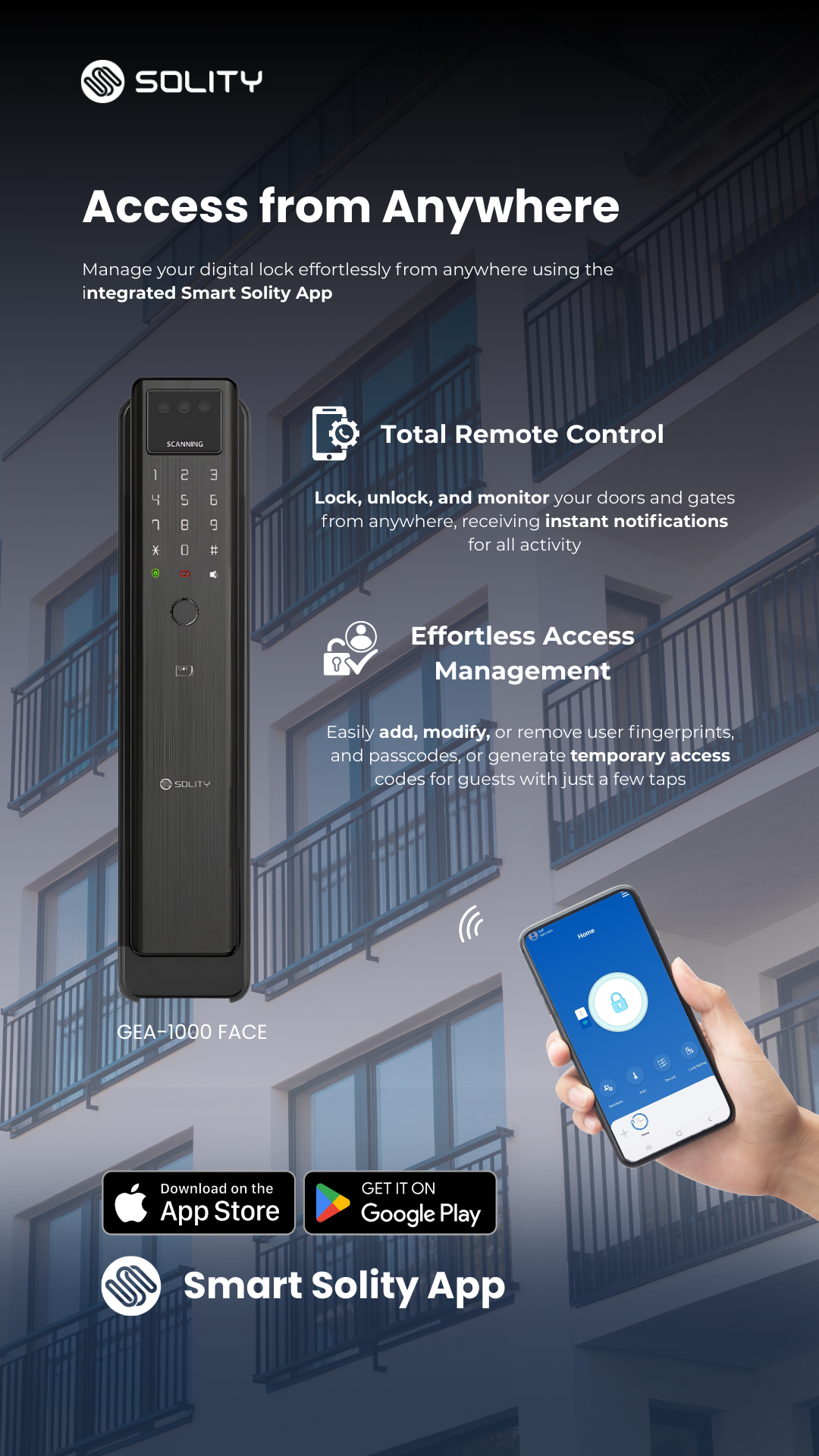 - Smart App Control (Built-in Wi-Fi): Manage your digital lock remotely via the Solity app.