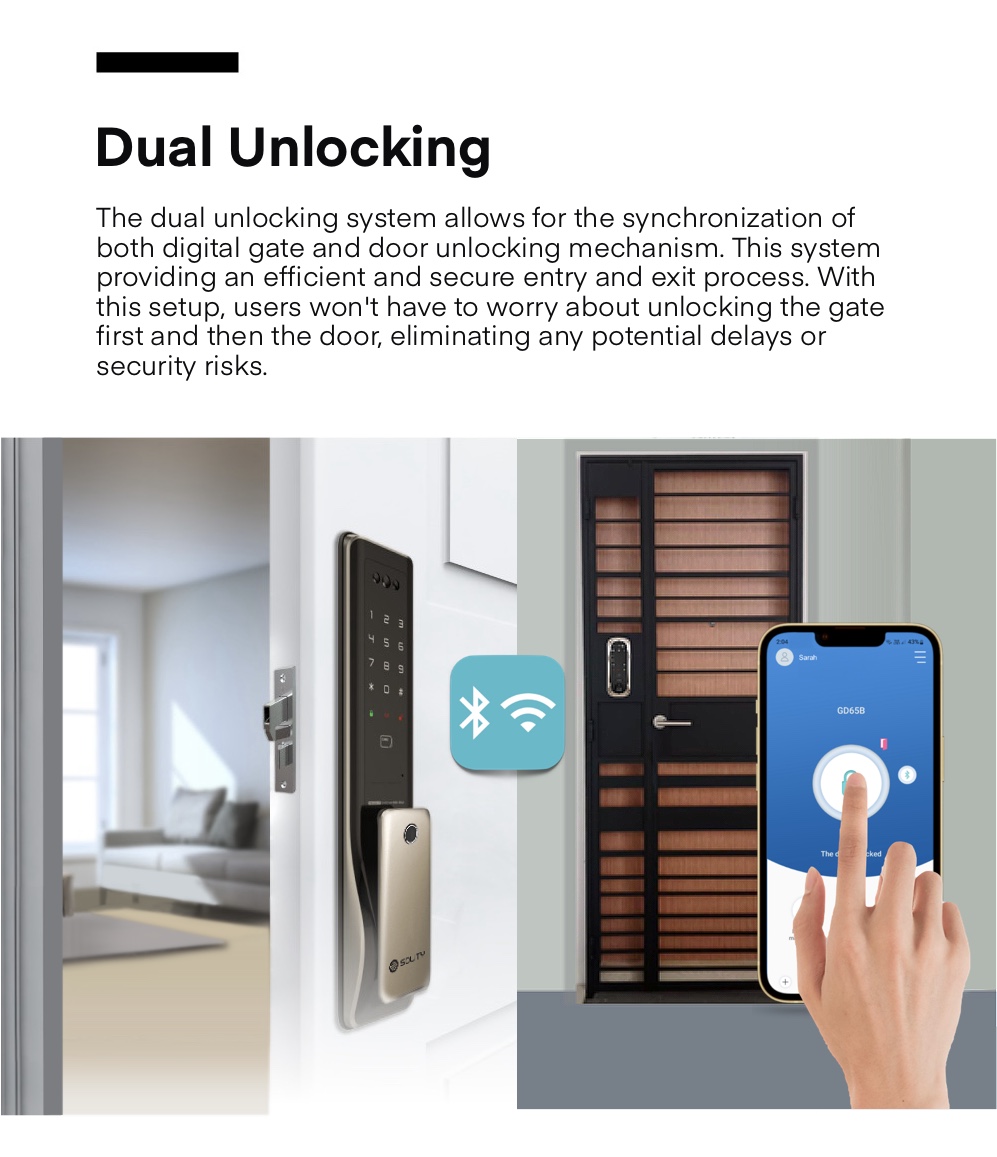 – Dual Unlocking Capable: Seamlessly sync with a compatible Solity gate lock for convenient dual-door unlocking.